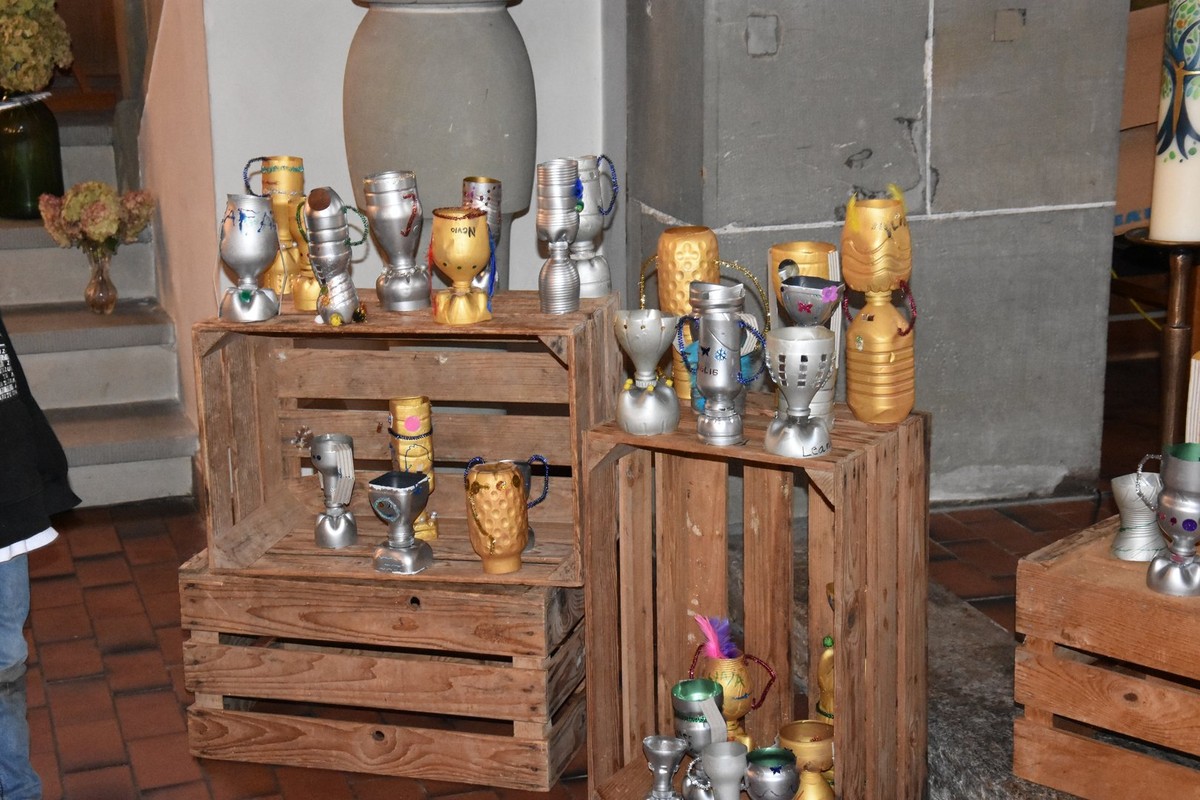 Etwas ruhiger ging es am Dienstag zu. Beim Basteln war eher Fingerfertigkeit gefragt. Zum einen wurden aus PET Flaschen Pokale gemacht und je nach Lust und Laune mit Federn, Perlen, Pailletten, Pfeifenputzern und, und, und dekoriert. Aus Konservendosen, die von den Kindern mit Nagel und Hammer gelocht wurden, entstanden wunderschöne Olympiafeuer-Windlichter. Beim Computer Spiel «Flappy crowd» wurde in drei Durchgängen pro Gruppe die Stimme trainiert. Je nach Lautstärke der Kinder flog das Vögelchen höher oder tiefer und schnell oder langsam. Danach konnten sie sich auf der Bühne des Kirchgemeinde Hauses als Baumeister betätigen und mit Holzabschnitten von der Firma Roth Türme, Brücken Mauern und vieles mehr bauen. Im Pfrundhaus und im Unterrichtszimmer ging es eher ruhiger zu. In ersterem konnten sich die Kinder 20 Minuten lang im Puzzeln üben. Und im Unterrichtszimmer warteten diverse Geduld- und Merkspiele darauf, dass sie gebraucht werden.